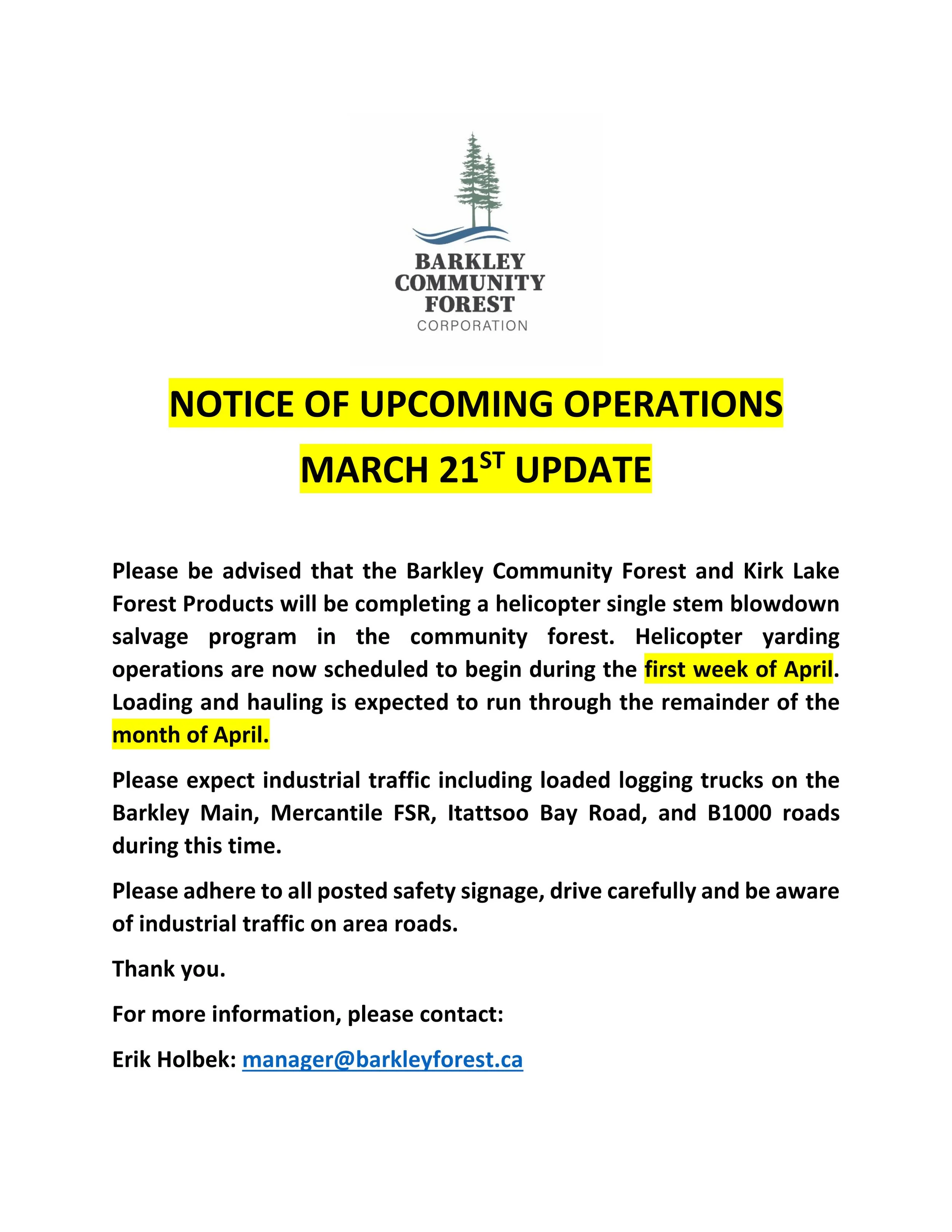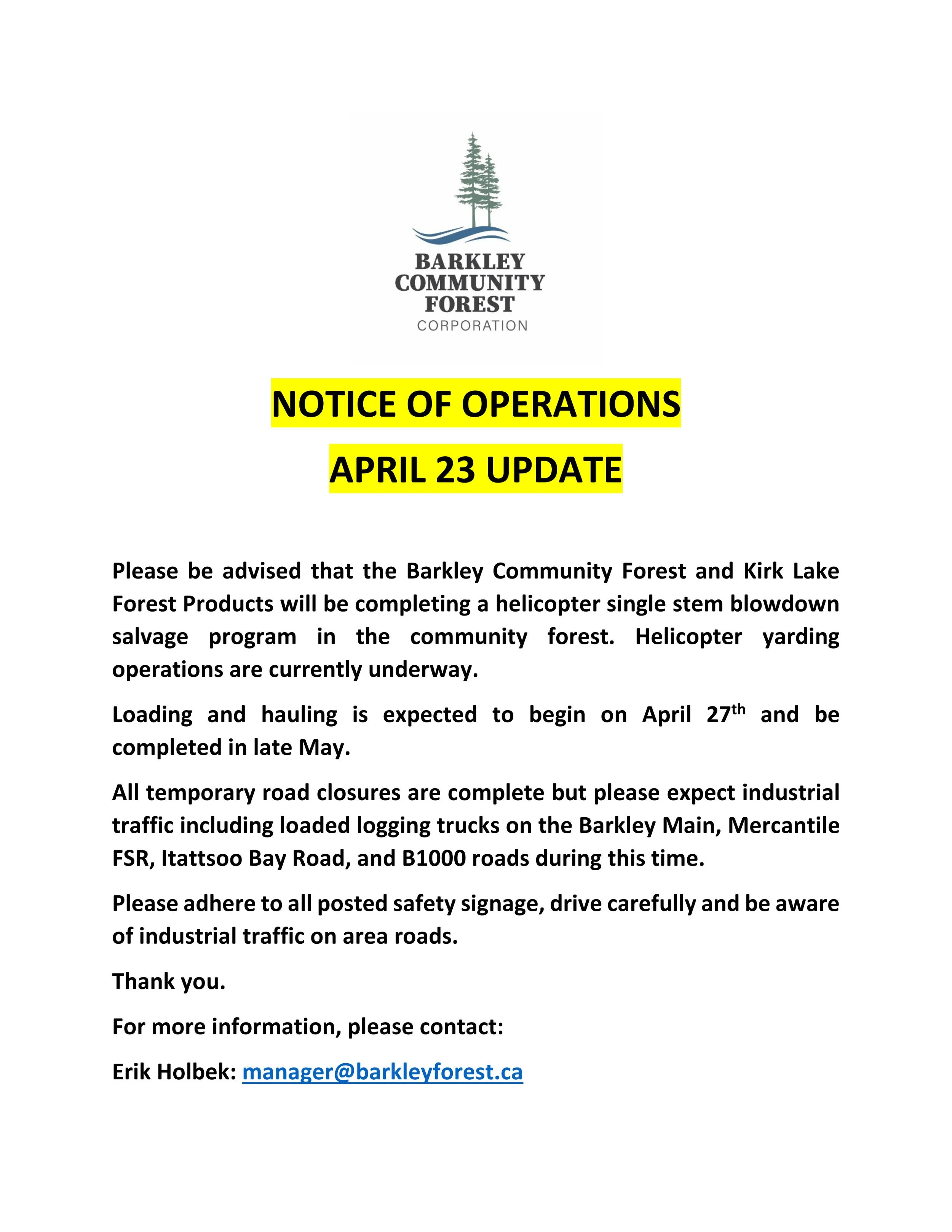Please be advised that the Barkley Community Forest and Kirk Lake Forest Products will be completing a helicopter single stem blowdown salvage program in the community forest. Helicopter yarding operations are now scheduled to begin during the first week of April. Loading and hauling is expected to run through the remainder of the month of April.